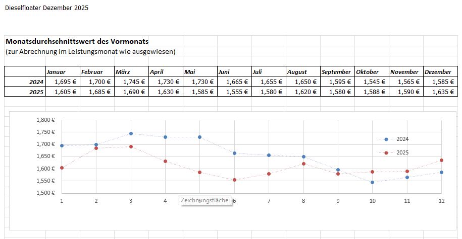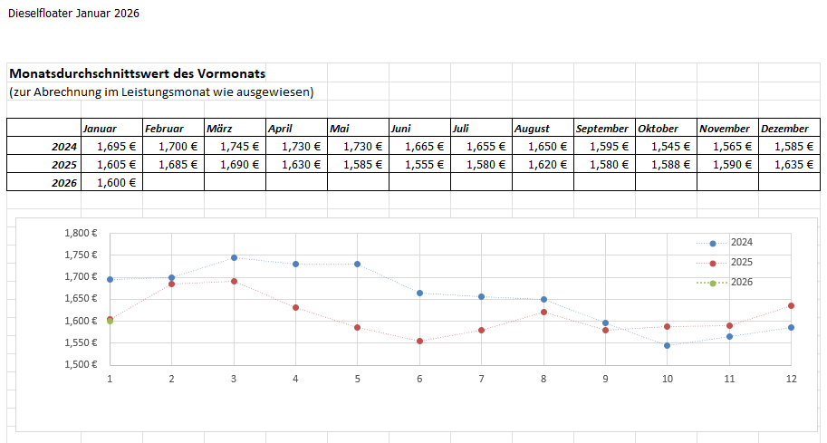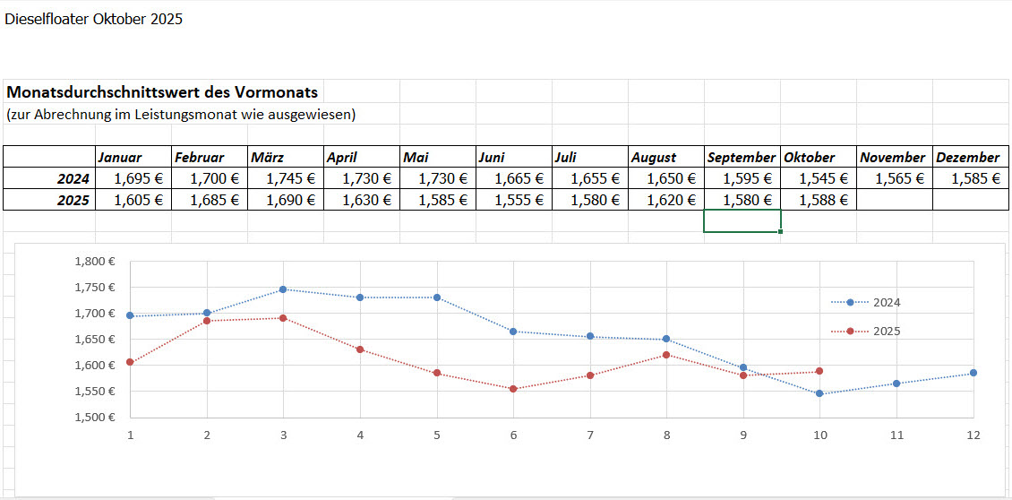 Wir referenzieren für die Berechnung des Dieselfloaters weiterhin auf den Index Statista, welcher nachvollziehbare Monatsdurchschnittspreise darstellt.